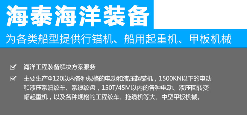 江蘇海泰海洋裝備有限公司位于素稱“銀杏之鄉(xiāng)”的泰興市,2018年投資建設(shè),至今已經(jīng)成為產(chǎn)品研發(fā)、生產(chǎn)制造,調(diào)試服務為一體的設(shè)備配套企業(yè)。公司從事海洋裝備(設(shè)備)及配件的制造、設(shè)計、安裝,維修;船用錨機、絞車、起重機、舾裝件、電氣設(shè)備、環(huán)保設(shè)備設(shè)計、制造。公司成立以來,就與中國船舶工業(yè)集團公司第701所、702所、704所、708所、上海船舶研究設(shè)計院等多家船舶科研院所建立了技術(shù)合作關(guān)系,產(chǎn)品應用于......